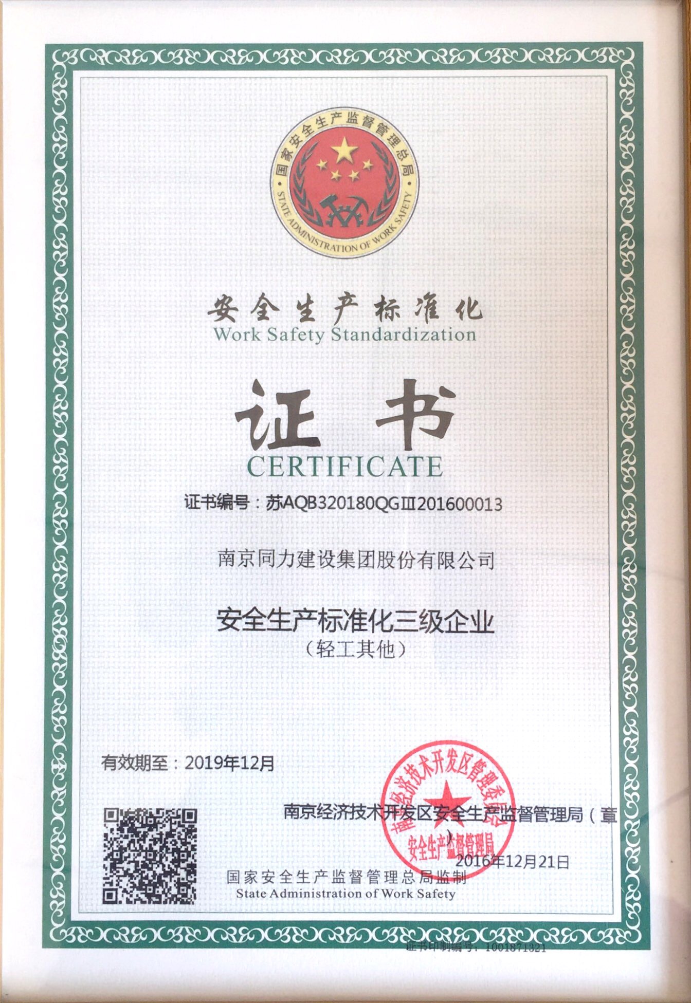 公司獲得《安全生產(chǎn)標(biāo)準(zhǔn)化三級(jí)企業(yè)》